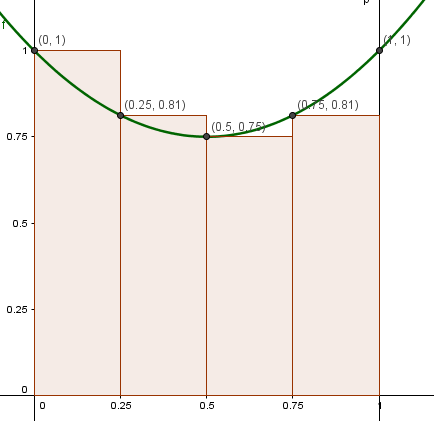 $$\begin{align}&f(x)= x2 – x +1, 0 ≤ x ≤ 1, para Δ: 4 intervalos iguales.\end{align}$$