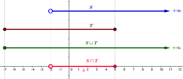 Calcule y grafica los conjuntos S ∪ T y S ∩ T. Si S = {x ∈ R: x > −2} y T = {x ∈ R : −7 ≤ x < 5}