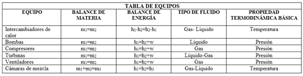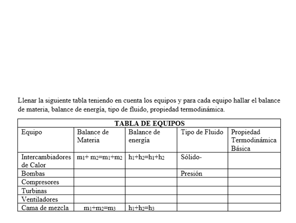 Hallar el balance de materia, energía, tipo de fluido, propiedad termodinámica básica de los equipos que se encuentran en la tab