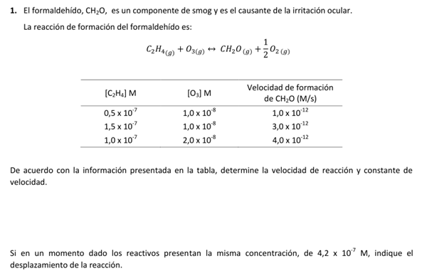 Por inspección de los datos de los experimentos 1 y 2 vemos que, cuando se triplica la concentración de C2H4 manteniéndose constante la concentración de O3, la velocidad también se triplica. Esto significa que v es proporcional a [C2H4] o, lo que es lo mismo,