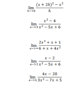$$\begin{align}&1) \lim_{h\to 0} \frac{(x+2h)^2-x^2}{h}=\\&\\&\lim_{h\to 0} \frac{x^2+4hx+4h^2-x^2}{h}=\\&\\&\lim_{h\to 0} \frac{4hx+4h^2}{h}=\\&\\&\lim_{h\to 0} \frac{4x+4h}{1}= 4x\\&\\&\\&2) \lim_{x\to 3} \frac{x^2-4}{x^2-5x+6}= \frac{9-4}{9-15+6}= \frac 50= \infty\\&\\&\\&3) \lim_{x\to \infty} \frac{2x^2+x+1}{6+x+4x^2}=\\&\\&\text{divido todo por }x^2\\&\\&\lim_{x\to \infty} \frac{2+ \frac 1x+\frac 1{x^2}}{\frac{6}{x^2}+ \frac 1x+4}= \frac{2+0+0}{0+0+4}= \frac 24= \frac 12\\&\end{align}$$