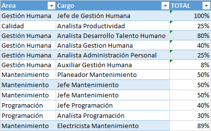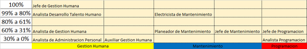 Una de las cosas mas importantes y por el motivo que no he podido realizar este procedimiento es que no quiero mezclar Áreas, si Analizan la columna 1 y 2 Pertenecen al Área de Gestión Humana, esto ocurre porque en el rango de 30% a 0 tengo 2 perfiles con el mismo peso, si tuviera 3 cargos en la misma Área serian 3 Columnas.