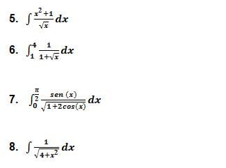$$\begin{align}&\int \frac{x^2+1}{\sqrt x}dx = \int\left( \frac{x^2}{\sqrt x}+ \frac 1 {\sqrt x }\right)dx=\\&\\&\int \left(x^{\frac 32}+x^{-\frac 12}\right)dx=\\&\\&\frac{x^{\frac 52}}{\frac 52}+ \frac{x^{\frac 12}}{\frac 12}+C = \frac 25 \sqrt{x^5}+2 \sqrt x+C\\&\\&------------------\\&\\&\int_1^4 \frac{1}{1+\sqrt x}dx=\\&\\&t=1+\sqrt x\implies \sqrt x=t-1\\&dt= \frac{dx}{2 \sqrt x}= \frac {dx}{2(t-1)}\implies dx=2(t-1)dt\\&\\&x=1\implies t= 1+ \sqrt 1=2\\&x=4\implies t=1+ \sqrt 4=3\\&\\&=\int_2^3 \frac 1t·2(t-1) \;dt= 2\int_2^3\left(1-\frac 1t\right)dt=\\&\\&2\bigg[t-ln\,t \bigg]_2^3= 2\left(3-ln\,3-2+ln\,2 \right)=2-2ln3+2ln2\end{align}$$Y eso es todo. Las otras no las veo fáciles a primera vista, deberás mandar una en cada pregunta. Sa lu dos.