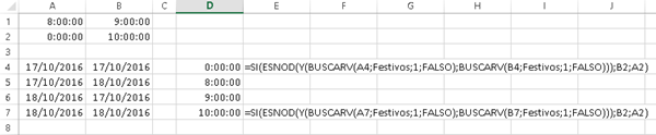 En D4 evalúo si las dos fechas se encuentran en la tabla Festivos ubicada en hoja2, como las dos son festivos entonces me muestra A2, en D7 es la misma fórmula pero en este caso ninguno es festivo y muestra B2.