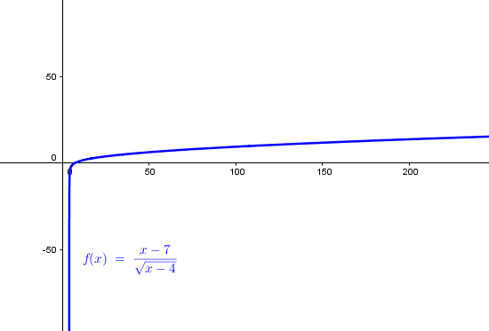 $$\begin{align}&y=\frac{x-7}{\sqrt{x-4}}\\&\\&y \sqrt{x-4}=x-7\\&\\&y^2(x-4) = x^2-14x+49\\&\\&y^2x-4y^2=x^2-14x+49\\&\\&x^2-14x-y^2x+49+4y^2=0\\&\\&x^2-(14+y^2)x+49+4y^2=0\\&\\&x= \frac{-14-y^2\pm \sqrt{(14+y^2)^2-4(49+4y^2)}}{2}\\&\\&\text{El dominio es donde el radicando es no negativo}\\&\\&196+28y^2+y^4-196-16y^2\ge0\\&\\&y^4+12y^2\ge0\\&\\&y^2(y^2+12)\ge 0\\&\\&y^2 \text{ es siempre positivo}\\&\\&y^2+12\ge0\\&\\&y^2\ge -12\\&\\&\text{Esto sucede siempre}\\&\\&Dom f^{-1]}=\mathbb R\implies Rango f=\mathbb R\end{align}$$Luego me sale que el rango es todo R, vamos a comprobarlo.