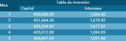 • En la inversión se utiliza un interés compuesto, donde cada mes se acumula el interés que le corresponde con el capital anterior.