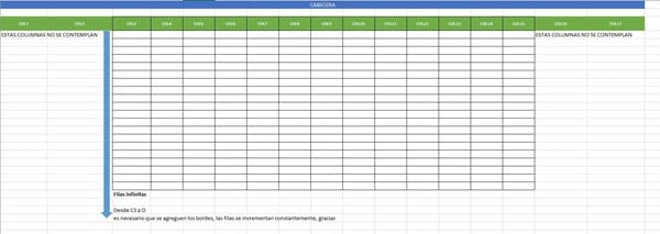 Una hoja con 17 columnas desde la A:Q con filas llenas de datos que se van incrementando constantemente. ¿La consulta es como lograr que por medio de una macro coloque bordes con color a cada una de las filas pero excluyendo las columnas A, B, P, Q? Como mencione al inicio el rango de filas es infinito ya que va incrementando diariamente. Dejo la estructura de mi hojita, gracias