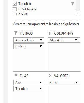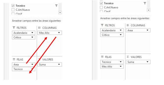 2.- El campo Mes lo arrastras al área de FILAS y el campo que contiene "CNE", "E", etc que yo llamé Area lo mueves al sector de COLUMNAS. Quedará como el cuadro de la derecha.