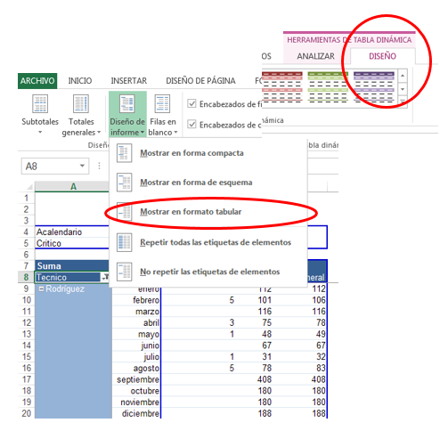 3.- Para finalizar, con la tabla seleccionada, verás en la parte superior derecha de la pantalla una pestaña DISEÑO. Haz click en ella y luego en el ícono "Diseño de Informe". Elije "Mostrar en formato tabular" del menú que aparezca: