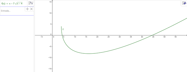 $$\begin{align}&f(x) = x - 7 \sqrt{x-4}\\&\text{Hay dos formas, una es intentando despejar x de la función (pero no lo veo fácil)}\\&\text{Otra es analizar la derivada para ver donde es estrictamente creciente y/o decreciente}\\&f'(x) = 1-7 \cdot \frac{1}{2 \sqrt{x-4}}=1- \frac{7}{2 \sqrt{x-4}}\\&\text{Tiene el mismo dominio que f(x) así que no hay problemas por ese lado, veamos donde tiene un extremo local}\\&f'(x) =0 = 1- \frac{7}{2 \sqrt{x-4}}\\&7 = 2 \sqrt{x-4}\\&\frac{7}{2} = \sqrt{x-4}\\&\frac{49}{4} = x-4 \\&x = \frac{49}{4} + 4 = \frac{65}{4} = 16.25\\&\text{Por la gráfica sabemos que será mínimo, pero vamos a verificarlo con la derivada segunda}\\&f''(x) = \frac{7}{4 (x-4)^{3/2}}\\&\text{No es necesario calcularlo, alcanza con saber que f''(16.25) > 0, por lo tanto es mínimo}\\&\text{Como la función está definida en }[4,+\infty) \text{, es continua en todo su dominio y tiene un mínimo en x=16.25}\\&\text{Podemos asegurar que la función tiene los siguientes intervalos de crecimiento/decrecimiento}\\&Crece: (16.25,+\infty)\\&Decrece:(4,16.25)\\&\text{Veamos el intervalo que decrece, para eso evaluemos}\\&f(4) = 4-7 \sqrt{4-4}=4 \ (máximo\ local)\\&f(16.25) = 16.25-7 \sqrt{16.25-4}=-8.25 \text{ (como sabemos que la función luego crece, este es un mínimo absoluto)}\\&\text{En el intervalo que crece, ya tenemos el extremo izquierdo, falta calcular el límite en }+\infty\\&\lim_{x \to +\infty} f(x) = \lim_{x \to +\infty} x - 7 \sqrt{x-4}=\lim_{x \to +\infty} (x - 7 \sqrt{x-4}) \cdot \frac{(x + 7 \sqrt{x-4})}{(x + 7 \sqrt{x-4})}=\\&\lim_{x \to +\infty} \frac{x^2 - 49 (x-4)}{(x + 7 \sqrt{x-4})}=\lim_{x \to +\infty} \frac{x^2(1 - \frac{49 (x-4)}{x^2})}{x(1 + \frac{7 \sqrt{x-4}}{x})}=\lim_{x \to +\infty} \frac{x(1 - \frac{49 (x-4)}{x^2})}{(1 + \frac{7 \sqrt{x-4}}{x})}=+\infty \text{ (Como era esperable)}\\&\text{Por lo tanto, el rango es }[-8.25,+\infty)\end{align}$$Salu2