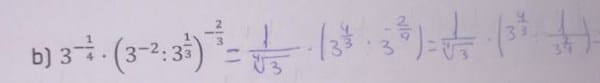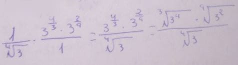 2)Calculo la potencia de lo que está dentro del paréntesis, después divido y multiplico. Me dá raíz con índice 9 de radicando 3^5 entre raíz cuarta de 3.