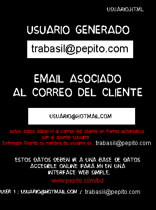El cliente visualiza su nombre de usuario en pantalla : Usuario Asignado: "[email protected]" se le envía un mail automático con un mensaje tipo autoresponder y se carga en BD este usuario al correo que coloco en el formulario inicial, debo accesar a los datos de la BD en forma online ; [url]www.pepito.com/bd[/url]