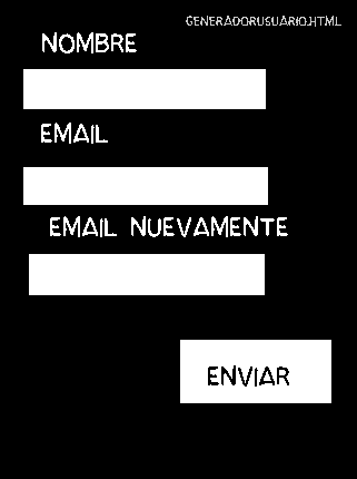 Entonces seria así, usuario entra a : generadorusuario.html, luego llenas los campos con tu nombre, email, email nuevamente, presiona ENVIAR y le lleva a otra página llamada usuario.html y te muestra el usuario generado y de paso le envía un correo automático al correo del cliente con los datos generados.-