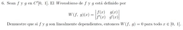 Sean f y g en C′[0, 1]. El Wronskiano de f y g está definido por