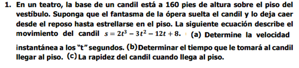 $$\begin{align}&s(t) = 2t^3-3t^2-12t+8\\&a)\\&v(t) = s'(t) = 6t^2-6t-12\\&b)\text{ Llegará al piso cuando}\\&s(t) = 2t^3-3t^2-12t+8=160\\&2t^3-3t^2-12t-152=0\\&\text{Veamos los divisores que nos interesan para buscar las posibles raíces:}\\&2: \pm1, \pm2\\&152: \pm1,\pm2, \pm4, \pm8, \pm19\\&Posibles \ raices \ racionales: \{ \pm1,\pm1/2, \pm2, \pm4, \pm8, \pm19, \pm19/2 \}\end{align}$$Si evaluás esos valores, verás que no hay una raíz racional para esa expresión. Por lo tanto el punto b) no se puede resolver de manera exacta. Se puede resolver de manera aproximada, pero no creo que hayas visto aún temas iterativos para encontrar la solución (ejemplo, el método de Newton - Raphson)