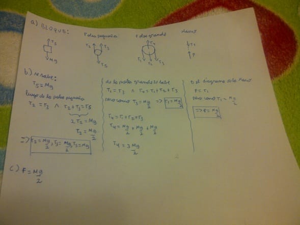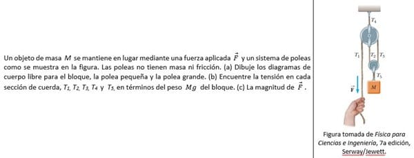 Un objeto de masa M se mantiene en lugar mediante una fuerza aplicada F ⃗ y un sistema de poleas.