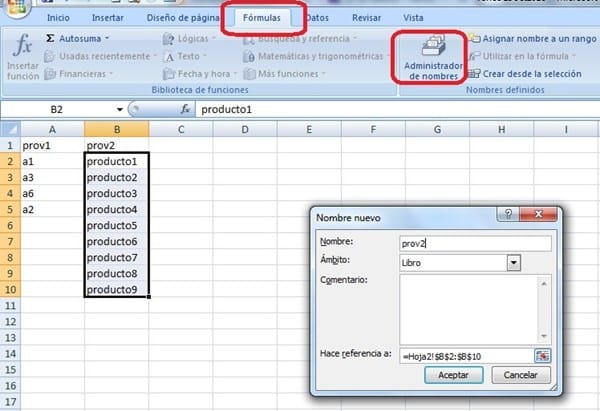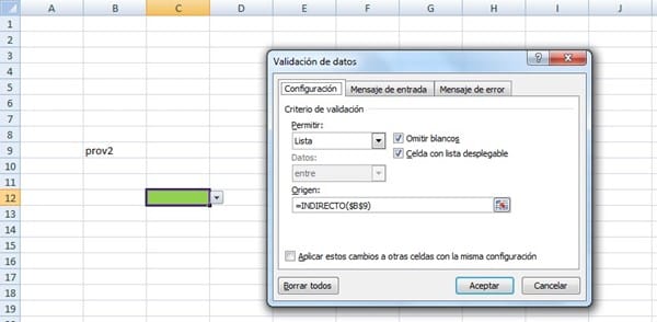 He creado un formulario en donde selecciono de una lista que está en otra hoja un nombre de proveedor, además en otra celda dentro del mismo formulario y dependiendo de lo seleccionado en la primera lista (proveedores), poder seleccionar los productos asociados a sólo ese proveedor. Todo lo anterior utilizando los rangos para los nombres de proveedores y respectivos productos. El problema es que cuando hago referencia a la selección del proveedor (en celda B9 para mi ejemplo) e introduzco la función =INDIRECTO(B9) para que me muestre los productos, lo hace pero sólo con un proveedor y el resto no. Además esta instrucción (=indirecto...) la copia en otras celdas para ir seleccionando varios productos y no me resulta. Espero haber sido claro para que se entienda. Solicito por favor su ayuda. Desde ya muchas gracias.