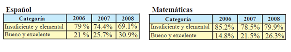 Las siguientes tablas muestran los resultados de la prueba Enlace del 2006 al 2007 en español y matemáticas. ¿Cómo es la evolución en cada materia? ¿En qué materia salieron mejor? Argumenta.