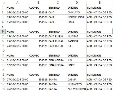 Tengo una tabla de 5 columnas y datos repetidos (Entidad) deseo agruparlos y a cada grupo poner la cabecera .