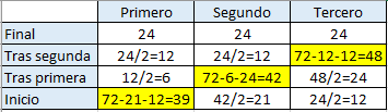 Y como te decía, esto se resuelve mucho más rápido yendo del final al principio. Si el tercero perdió la última partida los otro duplicaron, luego antes tenían 12 y 12 y el tercero tenía las 72 que hay en total -12 y -12