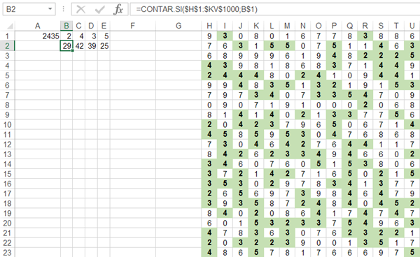 Ahora le agregué debajo de cada cifra una fórmula que, además, cuenta cuantas coincidencias hay en tu rango. En la parte superior de la imagen verás la fórmula que usé para la primera cifra.