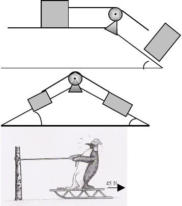Un pingüino de 5 kg esta sentado sobre un trineo de 10 kg, como en la figura. Se aplica al trineo una fuerza horizontal de 45 N, pero el pingüino intenta impedir el movimiento sujetándose de una cuerda atada a un árbol. El coeficiente de fricción cinética entre el trineo y la nieve, así como el que hay entre el trineo y el pingüino, es de 0.20.