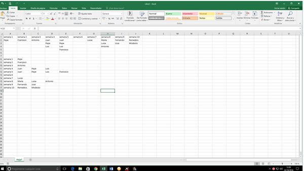 Me dan una tabla de 50 columnas con el encabezado "semana 1, "semana 2",... Son las 50 semanas entre las que pueden elegir los empleados 6 de ellas de vacaciones. Debajo van los nombres de los empleados que las han elegido.