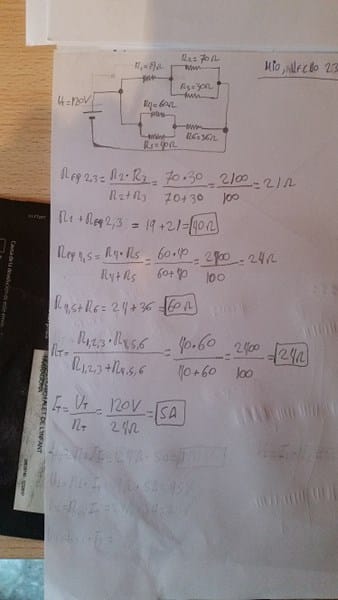 Acabo de iniciar un ciclo formativo, y ahora toca dar circuitos mixtos. Adjunto foto en la que me he inventado un circuito en el que "creo" que tengo el principio bien, "solo lo creo". Suponiendo que esto sea así, me gustaría que me ayudaran a resolver tanto las Intensidades parciales como las caídas de tensión de cada resistencia y si hay algo mal en el principio del circuito, me lo digan también.