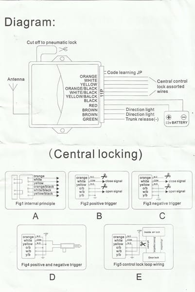Hace unos días he pillado en amazon una centralita de cierre centralizado para instalarla en el coche y muy bien, viene con sus 2 mandos y un escueto diagrama: