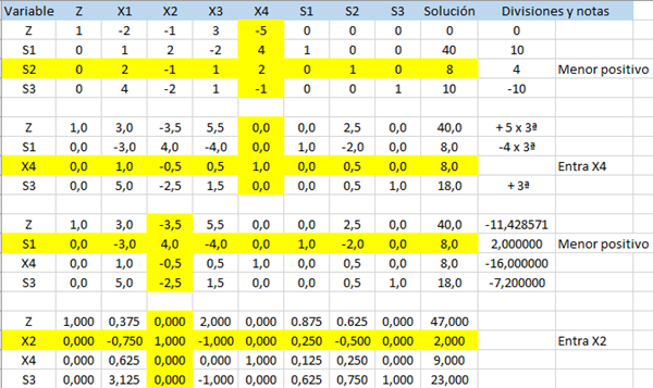 El pivote es la intersección de fila y columna, dividimos la fila entre el pivote en la segunda tabla y ponemos el nombre de la variable de la columna pivote (X4) a la izquierda de la fila en sustitución de la variable de holgura (S2) que había.