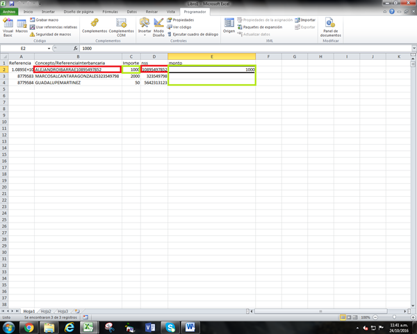 En la fila E, se encuentran nss (Titulo en E1) y quiero buscar los números que tiene en la columna B 8de B2 hasta B400 ya que son 4000 registros) y cuando los encuentre, que la columna C (IMPORTE) se copie a la columna E2