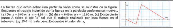La fuerza que actúa sobre una partícula varía como se muestra en la figura. Encuentre el trabajo invertido por la fuerza en la partícula conforme se mueve… (a) De x= 0 m ; (b) de 0 m a 15 m . (c) Existe cierto punto A sobre el eje “x” tal que el trabajo realizado por esta fuerza en el intervalo (Para, 15m) vale cero. Encuentre el valor de Para.