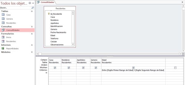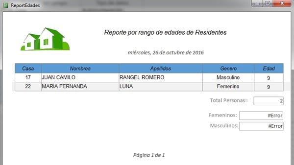 Tabla 1: Residentes (Campos: Id_Residente, Casa, Nombres, Apellidos, Identificación, Genero; FechaNacimiento, Edad... Etc)