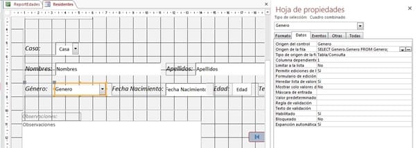He creado un formulario basado en la tabla "Residentes" para capturar la información de cada uno de los residentes; el campo "Genero" lo deje como un cuadro combinado para que solo me de las dos opciones guardadas en la tabla "Genero", como son FEMENINO Y MASCULINO.