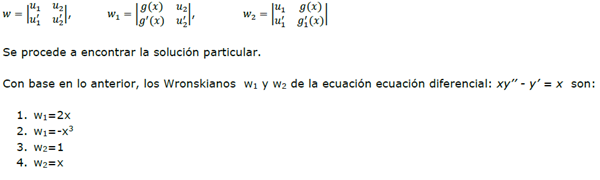 Para encontrar la solución de una ecuación diferencial de orden superior con coeficientes variables de la forma ?2(?)?2?(?)+?1(?)??(?)+?0(?)?(?)=?(?) se procede sustituir ? = ??,?′= ???−1, ?′′ =?(?−1)??−2 Para, en primera instancia hallar la solución de su respectiva ecuación homogénea asociada de la forma ?ℎ=?1?1+?2 ?2 y luego, con la ayuda de los wronskianos.