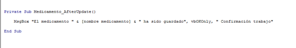 Tengo una tarea que es hacer una base de datos de una farmacia la cual ya hice, pero me piden que haga un formulario, y esto me piden. Las validaciones se debe hacer usando métodos. Si las validaciones son correctas se debe ingresar el medicamento. Una vez ingresado se debe mostrar el siguiente mensaje: “El medicamento [Nombre Medicamento] ha sido ingresado correctamente”. Mi problema es que no se como hacer que el nombre del medicamento se ponga en el mensaje, osea que si el medicamento acetaminofen en el cuadro de texto diga que el acetaminofen fue ingresaso.