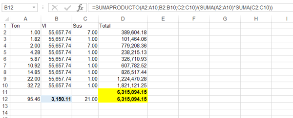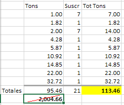 Existen tres valores los cuales tengo a disposición estos son Toneladas, Valor toneladas y numero de suscriptores, al realizar la multiplicación de estos me da un valor a cobrar como lo muestra la gráfica, pero para eso debo hacer las operaciones individuales, lo que se requiere es que yo pueda sumar la toneladas, los suscriptores y multiplique por una factor que me de el mismo resultado como si lo hiciera individual. Se aclara que los datos varían, por lo cual el resultado final es diferente.