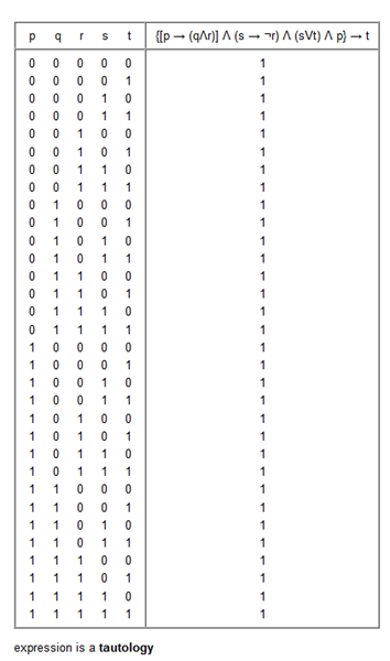 {[p --> (q^r)] ^ (s --> ~r) ^( s v t) ^ p} --> t