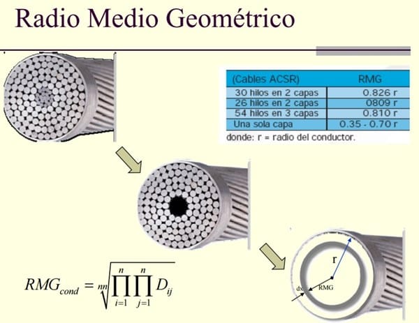Siendo cada conductor compuesto por 3 hilos……. El Radio Medio Geométrico RMG es la raíz (3^2) del producto de cada uno de los hilos a si mismo y a los restantes.