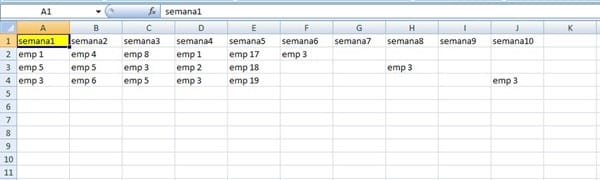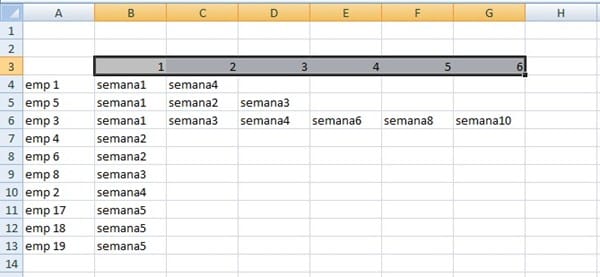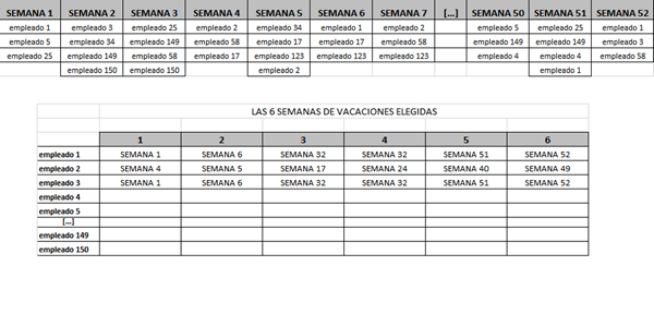 Cada empleado (unos 150) elige seis semanas del año de vacaciones, luego según unos criterios de preferencia rotatorios, se le asignan y se crea la tabla de arriba. Ahora yo tengo que pasar otra tabla con el listado de empleados en una columna, seguido por cada una de las 6 semanas que les han sido asignadas.