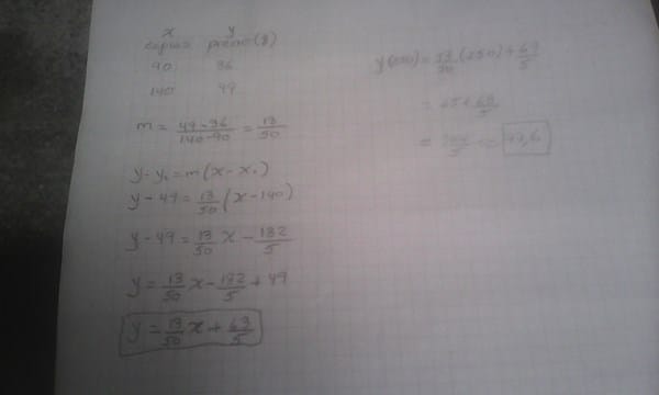 En una papelería se sacan fotocopias y cobran $36 por 90 copias de un trabajo; por 140 copias del mismo trabajo cobran $49. Supongamos que la relación entre el número de copias POR y el precio Y es lineal, encontrar la ecuación que relaciona ambas variables y usarla para calcular el costo de 250 copias.