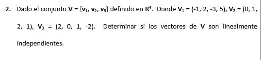 2. Dado el conjunto V = {v1, v2, v3} definido en R4. Donde V1 = (-1, 2, -3, 5), V2 = (0, 1, 2, 1), V3 = (2, 0, 1, -2). Determi