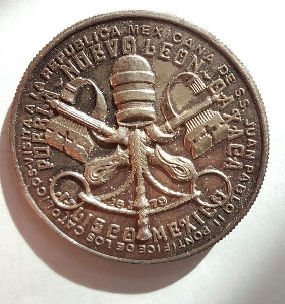 Tengo una moneda que conmemora la visita de Juan Pablo II a México y desconozco su valor. Envío fotos para determinarlo más fácilmente. Muchas gracias.