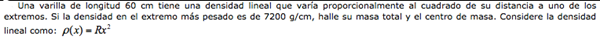 Básicamente, esto es lo que tenemos, el dato de 7200 nos dará el valor de R sustituyendo en x 60 cm. Para resolver la integral triple, nos damos cuenta que el dz y el dy no intervienen en la integral y la densidad es constante para cualquier diferencial de estos dos, por lo tanto dy dz serán la superfície de la base de la varilla que le llamaremos S