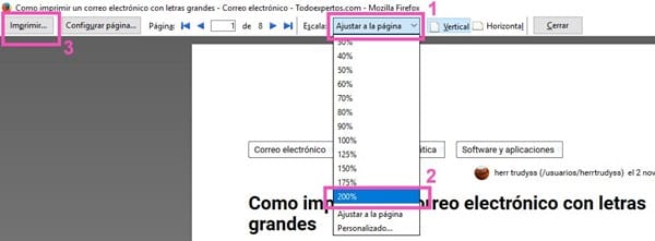 Cuando recibo un correo electrónico, a veces viene con letras muy pequeñas. Quisiera imprimirlo aumentando su tamaño y centrando la parte que más me interesa. ¿Cómo se hace?
