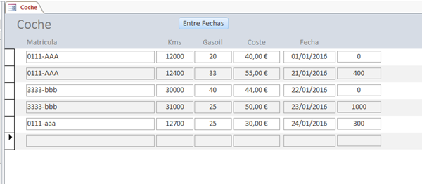 En una consulta tengo los campos matricula, kms. Combustible, coste, fechacombustible: