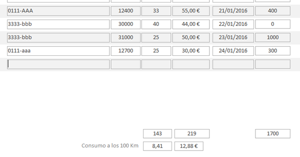Creo otra consulta que con el parámetro entre fechas, me va a dar el resultado de kms recorridos, Sumaconsumo y Sumacoste. El problema es por ejemplo que si cojo entre 21/01/2016 y la ultima fecha me da que ha recorrido 700km, ha gastado 57 litros y con un coste de 63€ y lo que necesito es que recoja el registro anterior de km. Por lo que sería: 1000km - 57 Litros - 63€, con estas ultimas cantidades si puedo sacar una media de consumo real.
