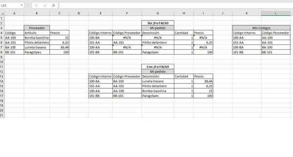 Mi situación es la siguiente, soy empleado en una empresa de ventas de repuestos y accesorios para camiones, mi puesto es encargado de compras. Tengo problemas para usar la función buscarv; lo que necesito hacer es lo siguiente, el proveedor me envía su lista de precios a lo cual yo confecciono un pedido con mis códigos, por lo que tengo las siguientes columnas: Códigos Internos, Códigos de Prov., Descripción, Cantidad y Precio, cuando escribo la función buscarv para que me traiga los precios de la lista de precios de proveedor a mi planilla de pedido me entrega en pantalla #N/A en la mayoría de los artículos y en otros si me entrega los precios.