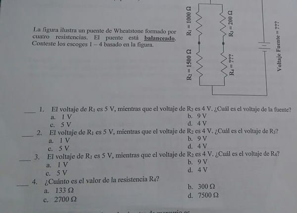Totalmente de acuerdo Ing... pero reitero que con 9 volt aplicados nunca puede haber una relación de tensiones 5/4=1.25 sobre resistencias en serie con relación de resistencias 1000/1500 = 0.666... los datos están mal dados... - albert buscapolos Ing°