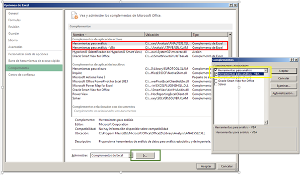 Para activarlos, presiona el botón "Ir..." (abajo en verde) y coloca una marca a ambas casillas que te indico en amarillo. Luego dale Aceptar a esta ventana y a la de complementos.